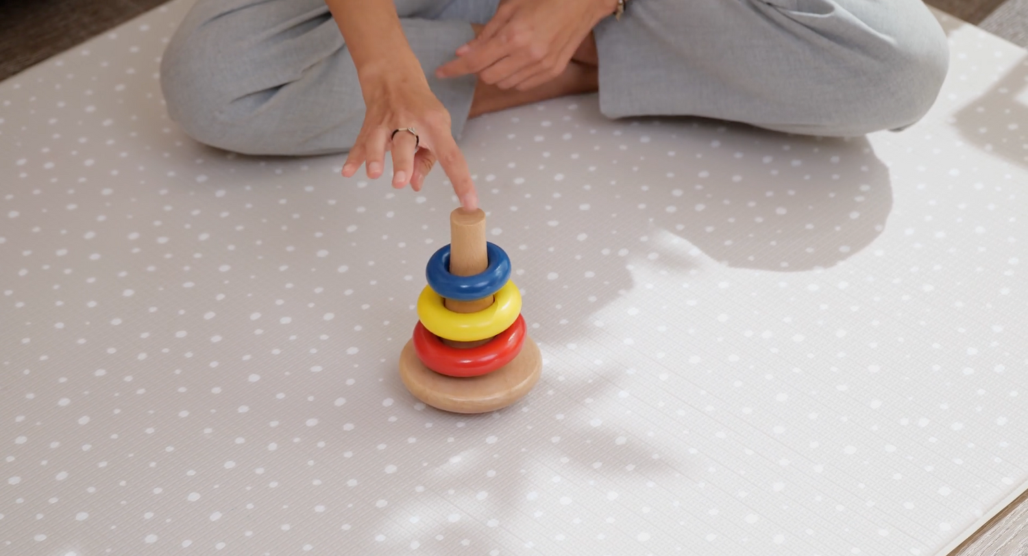 El bebé afina su precisión y coordinación al colocar los aros sobre una base que se balancea.