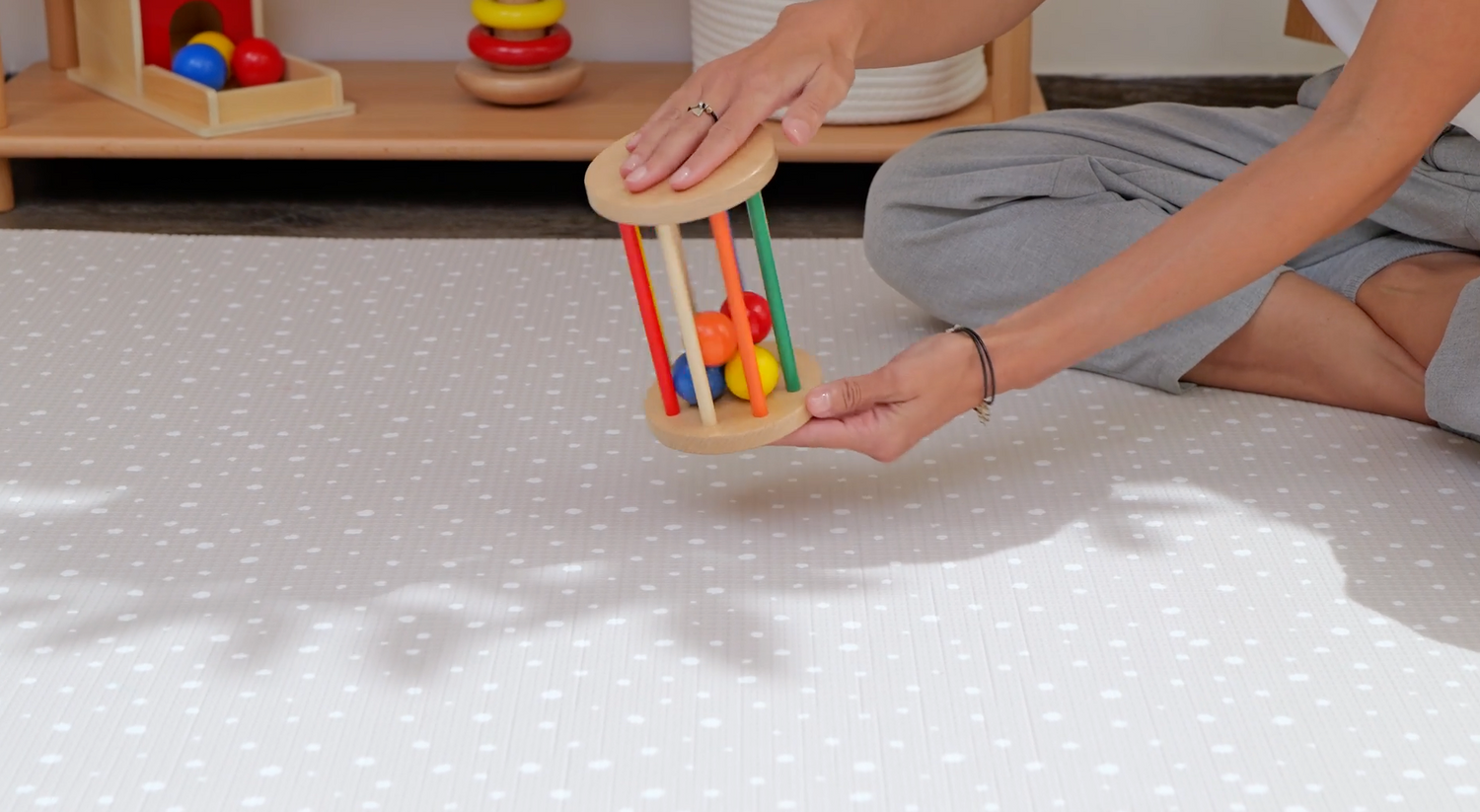 - Usa un tapete o superficie firme y antideslizante que le permita rodar, empujarse y practicar el gateo mientras explora los materiales del kit.