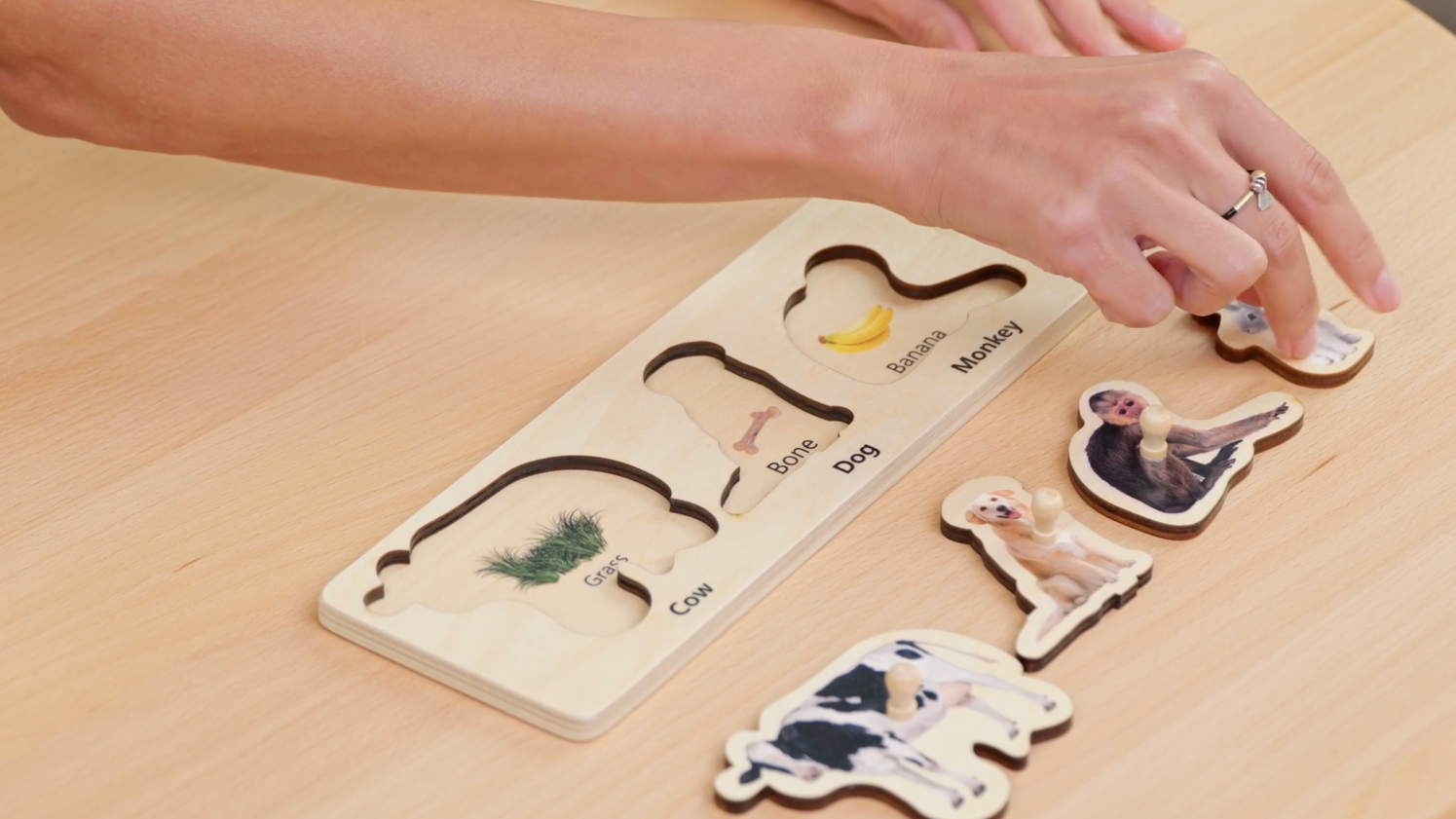 Relaciona animales y alimentos, fortaleciendo la lógica, el lenguaje y la precisión al encajar las piezas.