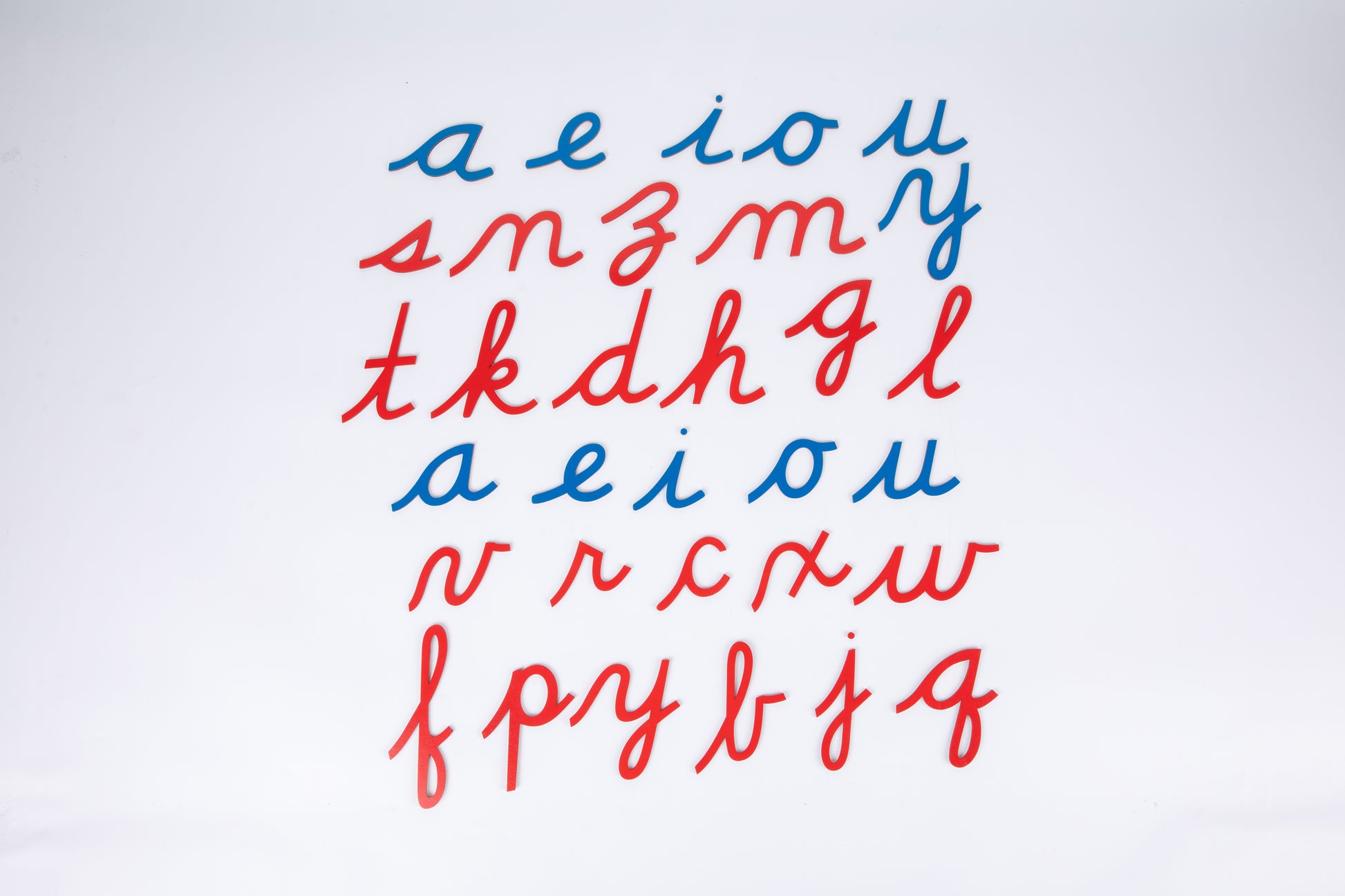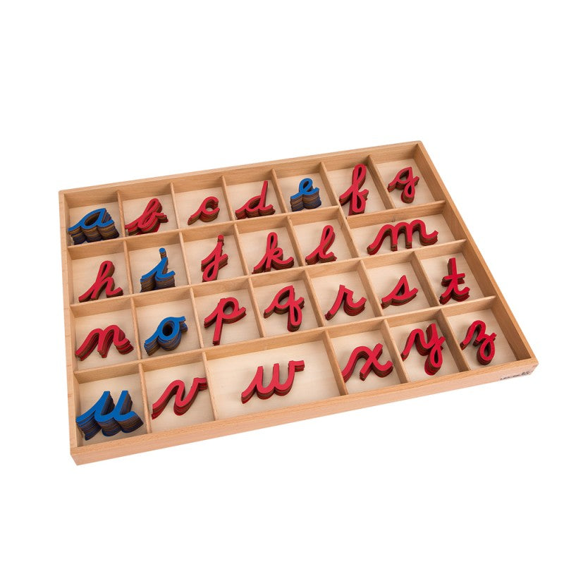 Caja de madera que contiene 5 letras de cada consonante en rojo y 10 letras de cada vocal en azul en cursiva. Todas las letras están hechas de madera.