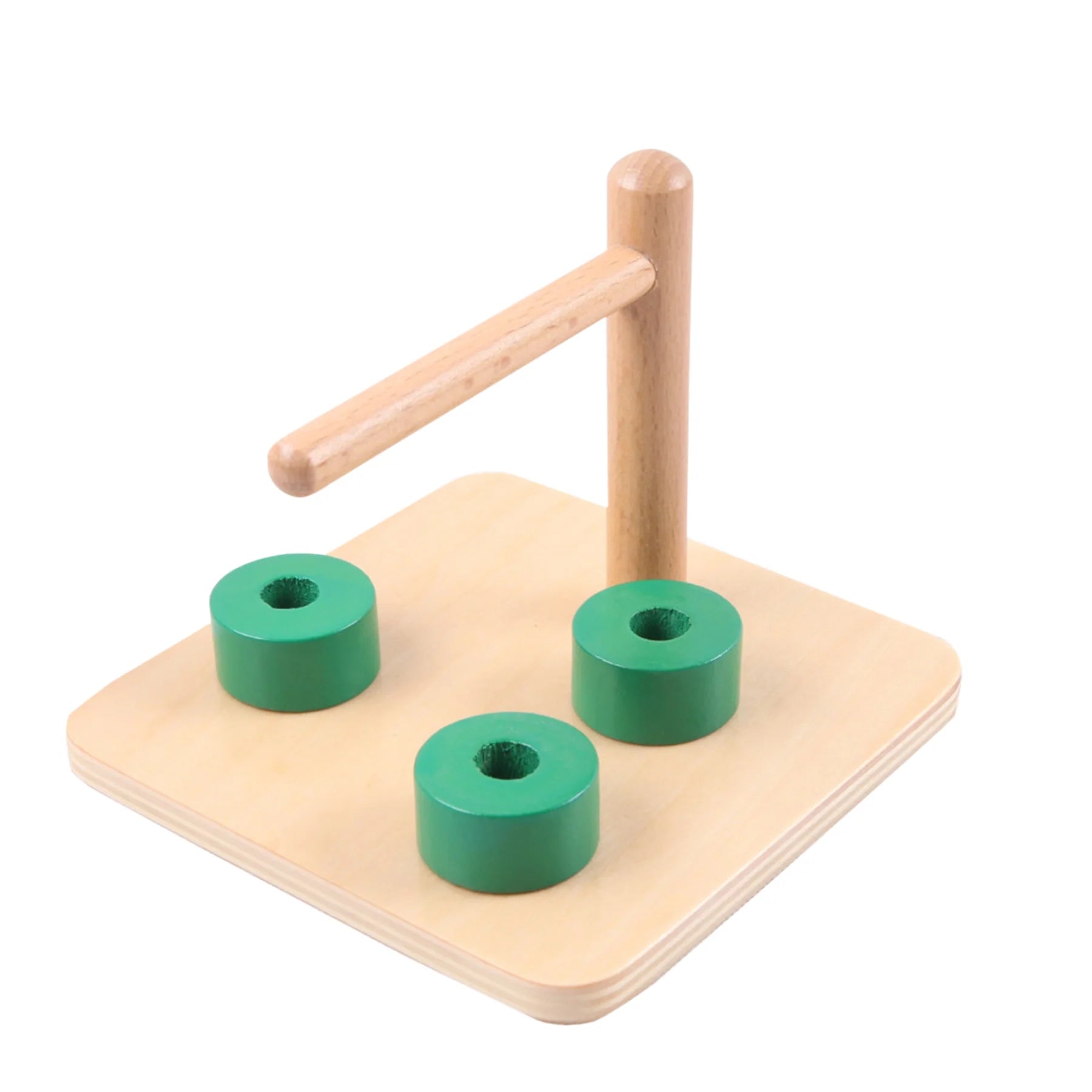 Base de madera con asta horizontal y aros verdes para desarrollar la coordinación ojo-mano y el agarre.