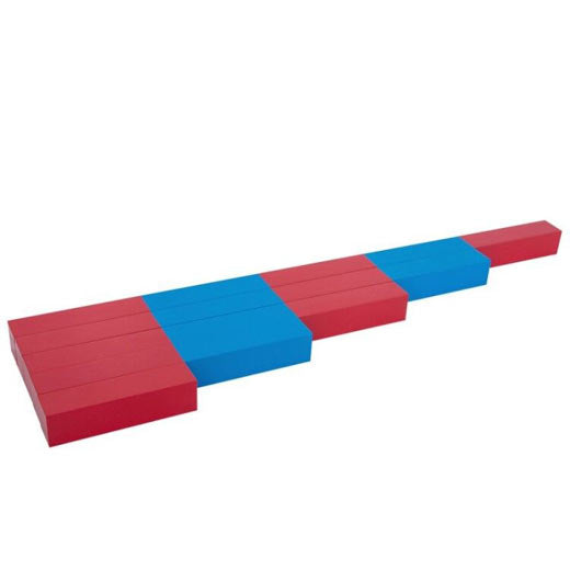 Set de 5 barras de madera color azul y rojo intercalado, que representan las cantidades del 1 al 5. Incluye las barras 1, 2, 3, 4 y 5, de corta a larga, de las barras numéricas originales de 10 barras.