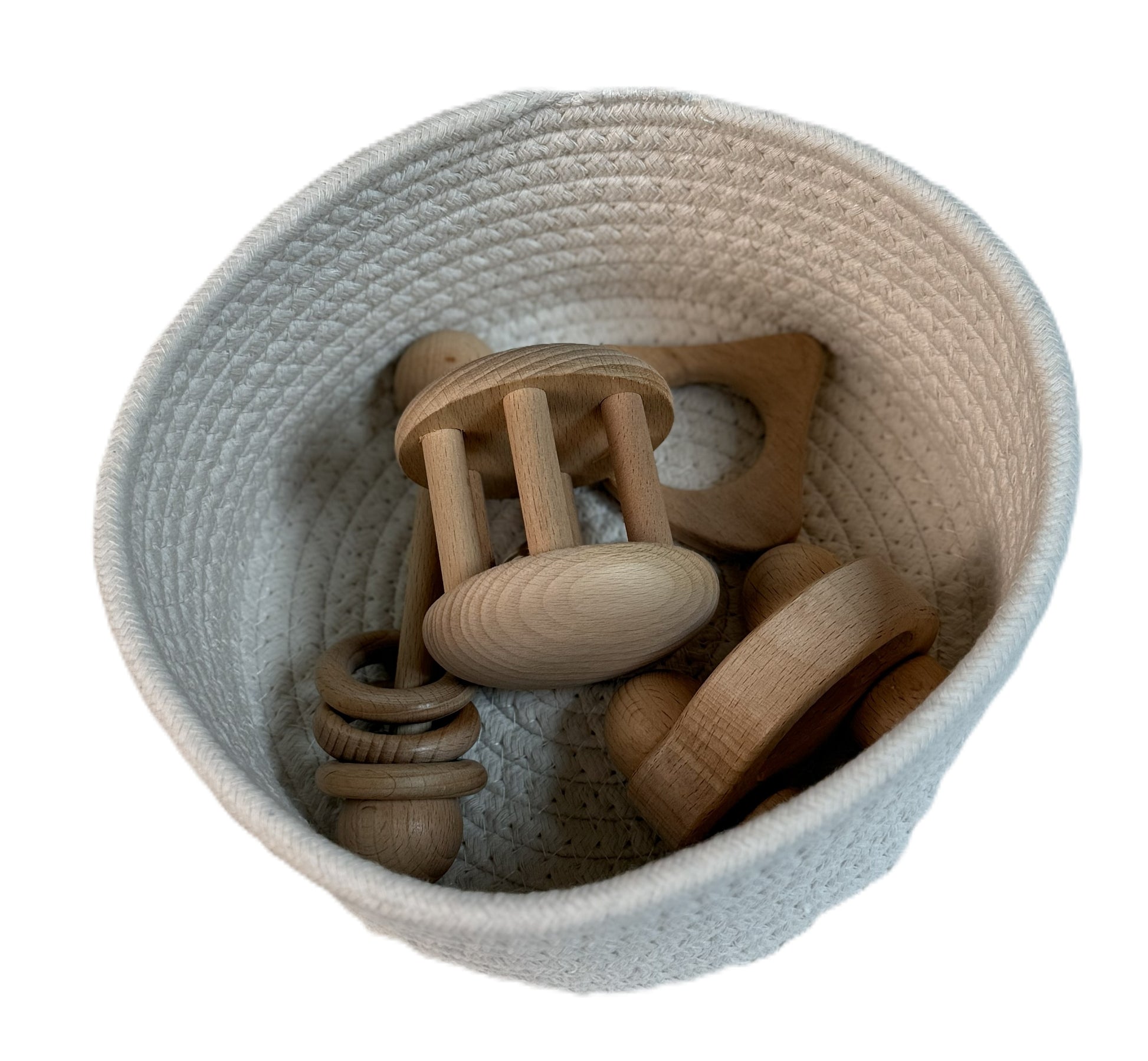 Canasta tejida de algodón con 4 materiales cuidadosamente seleccionados para estimular los sentidos y el movimiento del bebé. Combinamos distintos tipos de sonajas, mordederas o artículos de agarre que invitan a explorar, agarrar y descubrir.