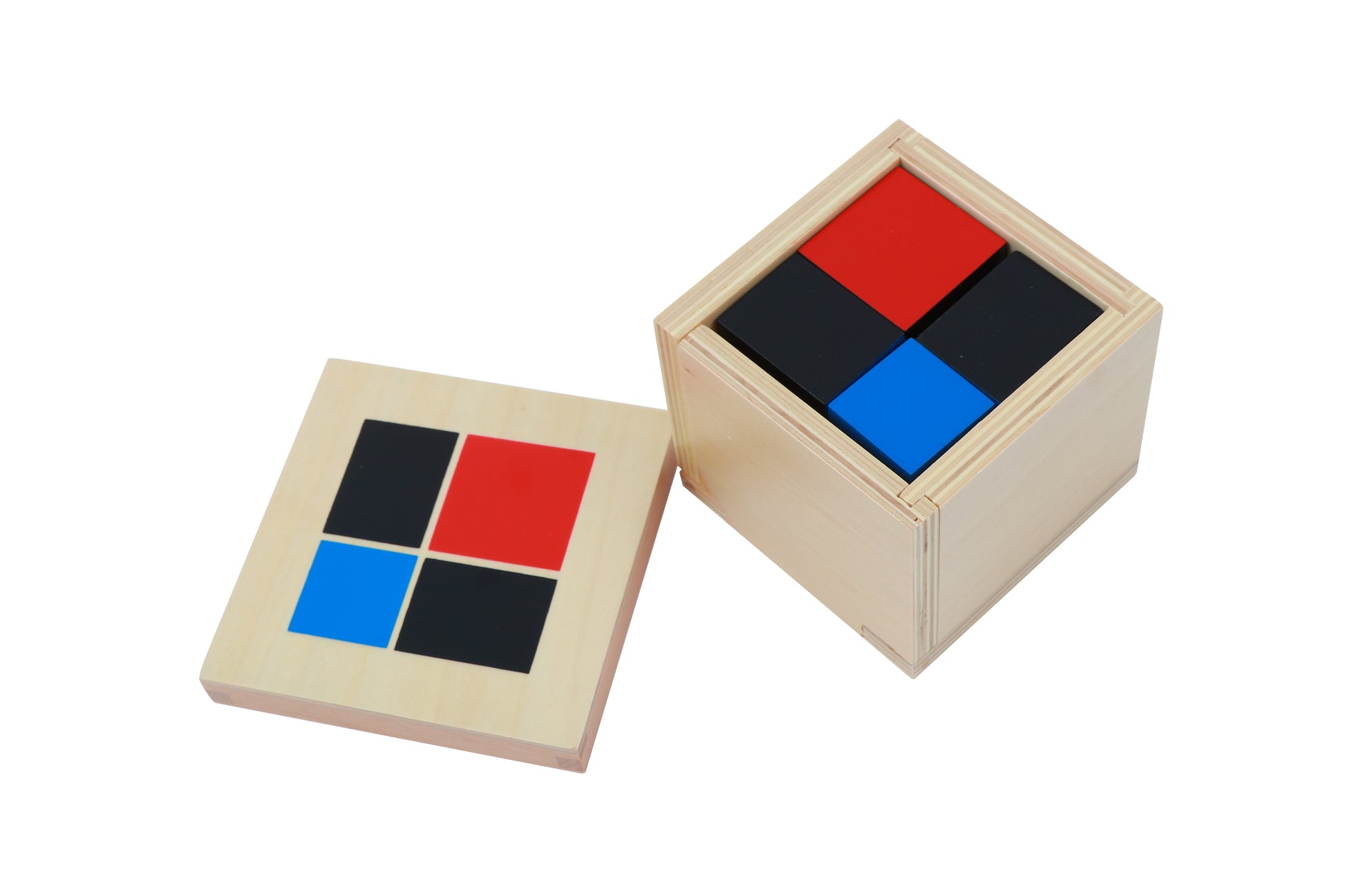 8 cubos de madera pintados en caja de madera con tapa. La caja tiene bisagras y abre hacia afuera para mostrar los cubos. La tapa lleva impreso el patrón cuadrado binomial.