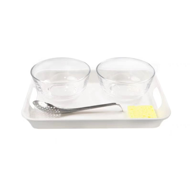 Charola con 2 recipientes idénticos y una cuchara, diseñada para que los niños practiquen la habilidad de cucharear.