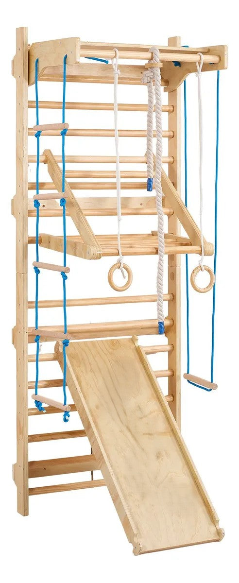El gimnasio de pared Bemerry es un sistema versátil y seguro que fortalece el cuerpo, mejora la coordinación y estimula la motricidad gruesa de forma divertida. Incluye rampa, escalera de cuerda, columpio, aros de gimnasia y cuerda para escalar.