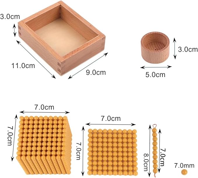 9 cubos de millar de cuentas plásticas, 45 centenas de cuentas plásticas, 45 decenas de cuentas (en caja de madera), 100 cuentas doradas (en copa), 1 juego de tarjetas grandes de papel grueso el 1 al 9000 con bandeja y 3 juegos de tarjetas pequeñas del 1 al 9000 con bandeja.