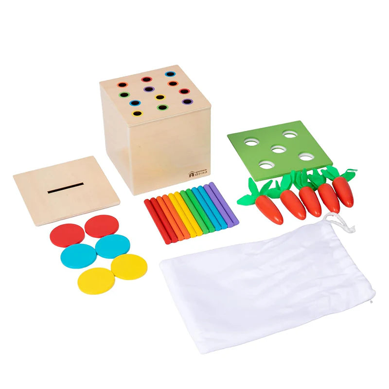 Este kit, inspirado en la filosofía Montessori, ofrece materiales que acompañan este momento clave, fortaleciendo la motricidad fina y gruesa, la concentración, el razonamiento, la imaginación y la conexión con su entorno.