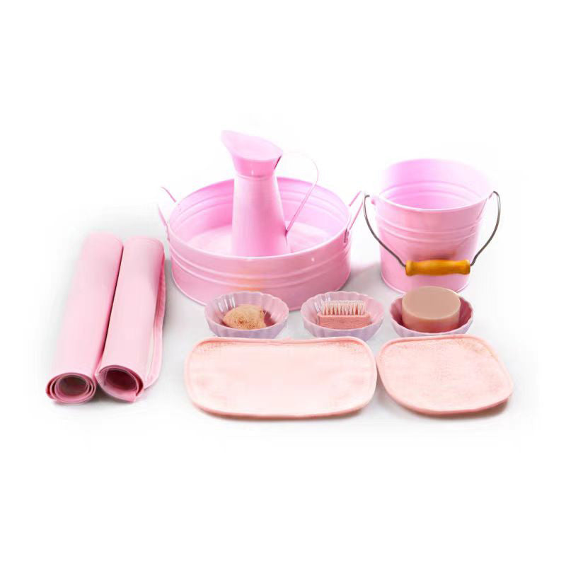 Una bandeja (lavamanos), jarra, cubeta, jabón artesanal, delantal, trapito y manopla de trapo.