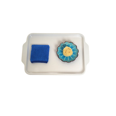 Recipiente, esponja natural mediana y manopla de trapo sobre charola.