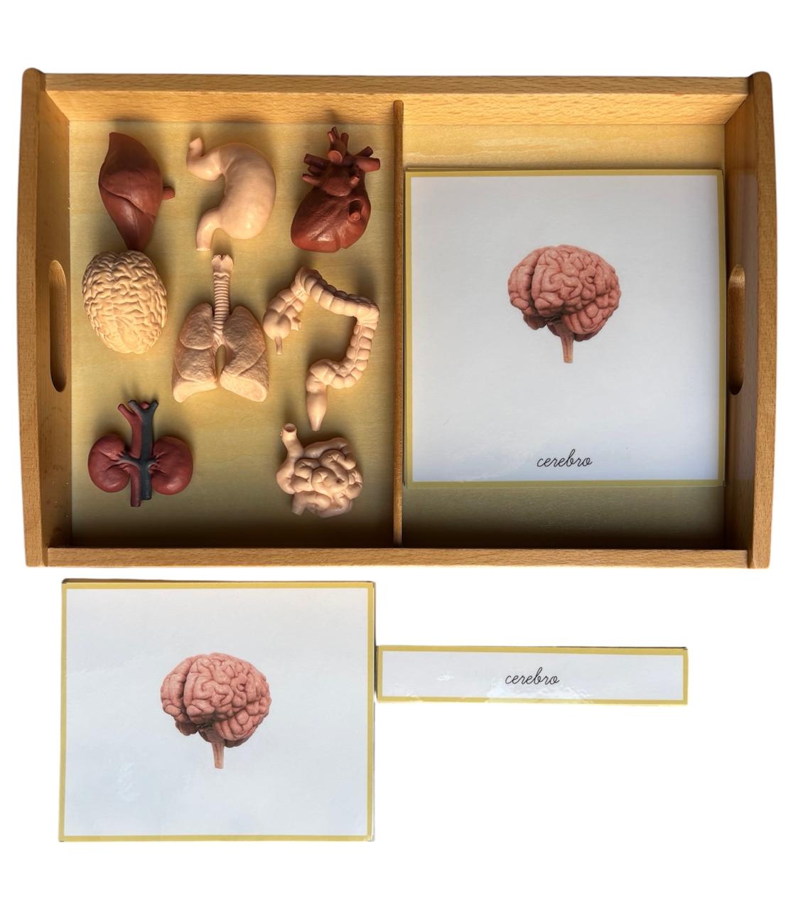 Objetos de órganos del cuerpo humano (8) con tarjetas en 3 partes que muestran imágenes similares a los objetos. Incluye charola de madera.