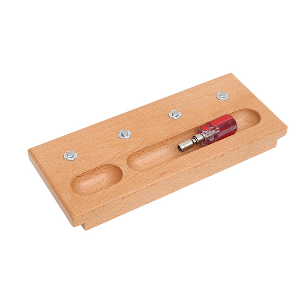Base de madera con 4 orificios, 4 tornillos hexagonales y un desarmador, diseñado para que los niños coloquen y quiten los tornillos cuantas veces deseen, fomentando la práctica de habilidades útiles para la vida.