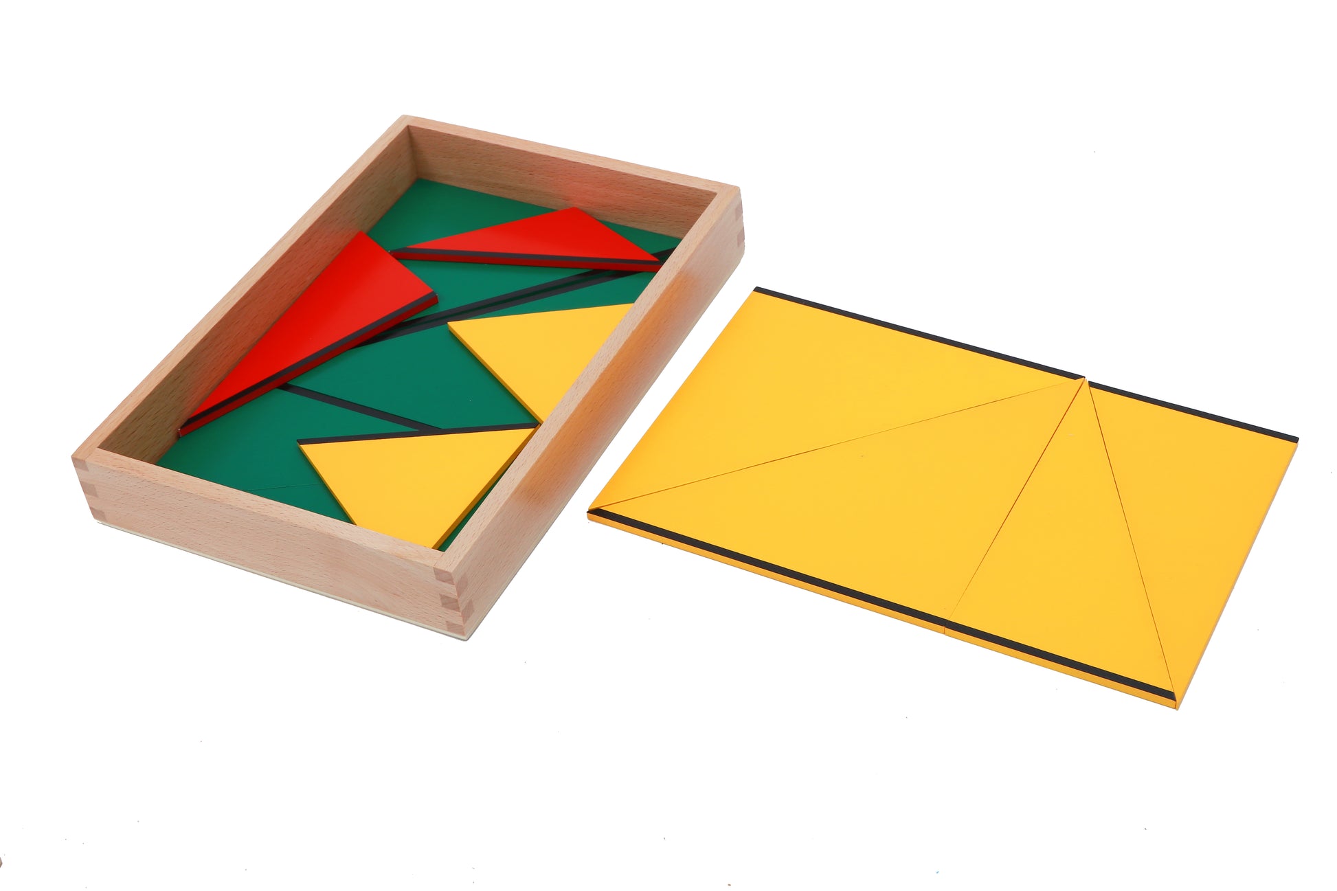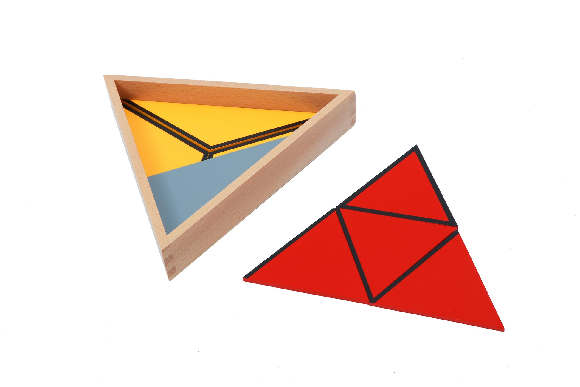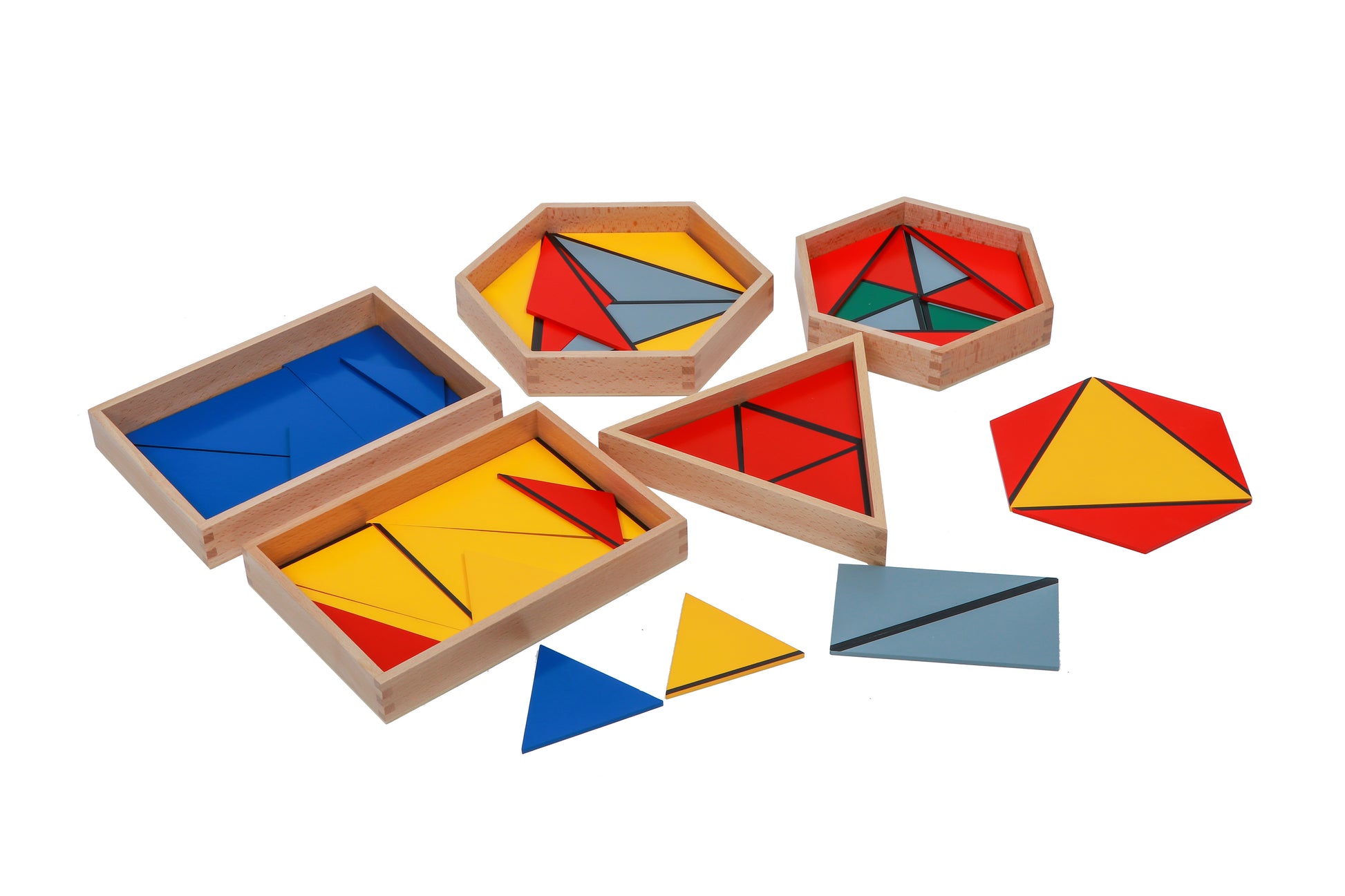 5 cajas de madera con tapa que contienen triángulos de diferentes tamaños, formas y colores.
