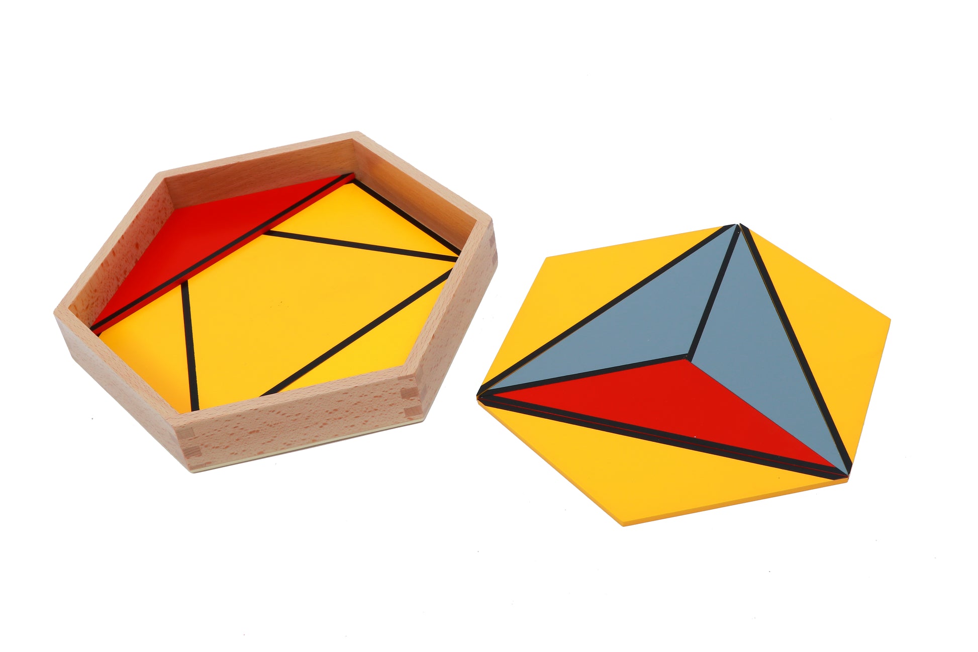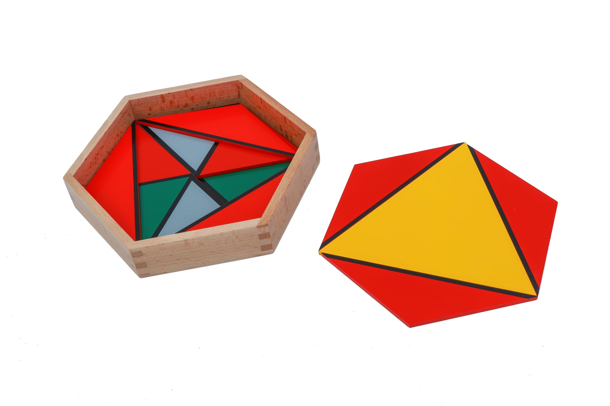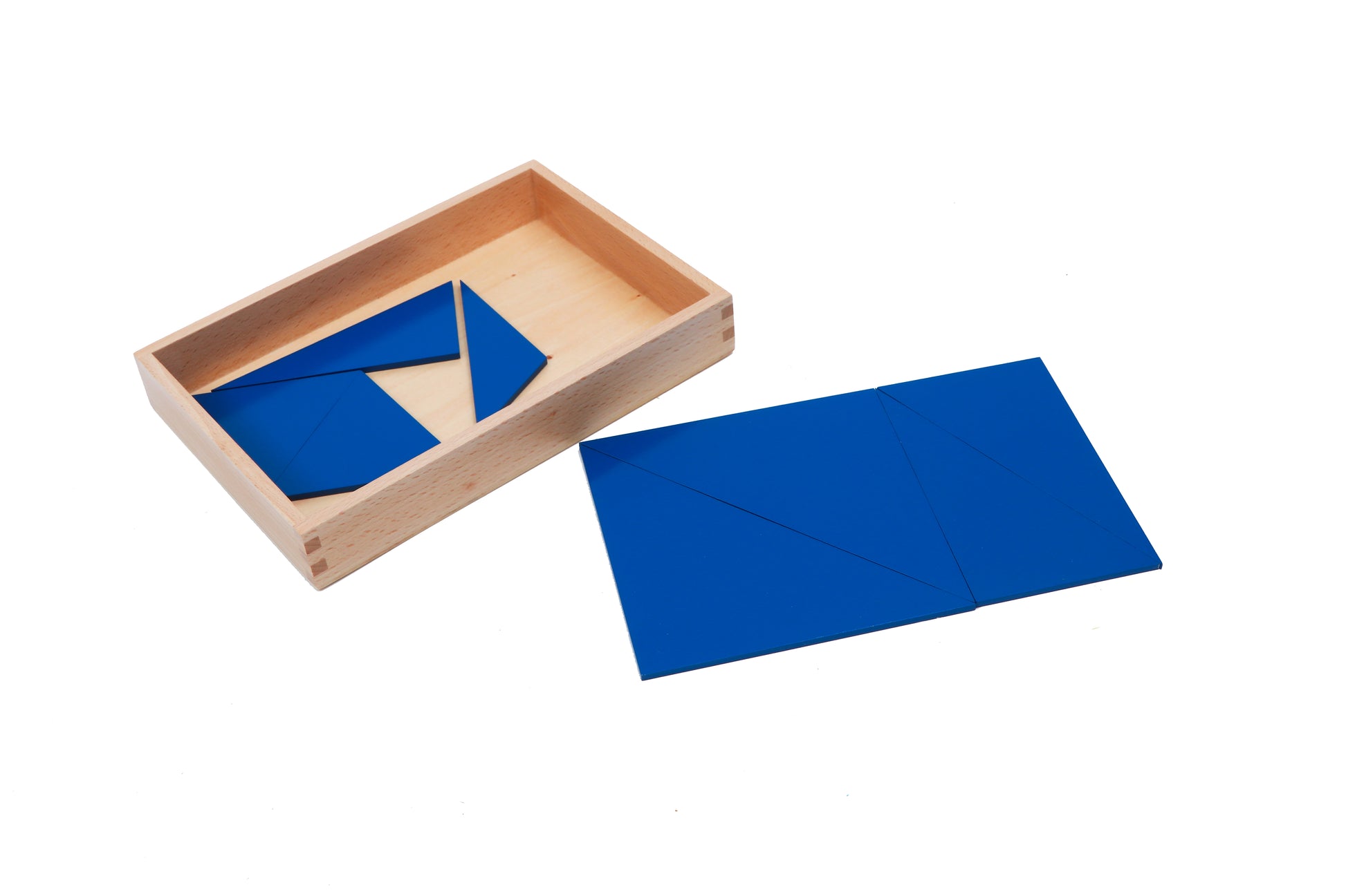 5 cajas de madera con tapa que contienen triángulos de diferentes tamaños, formas y colores.