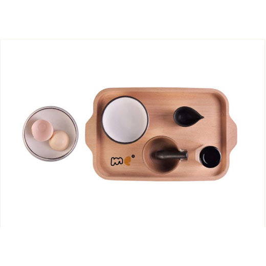 Charola de madera con tres recipientes de diferentes tamaños, un mortero y un botecito con tapa.
